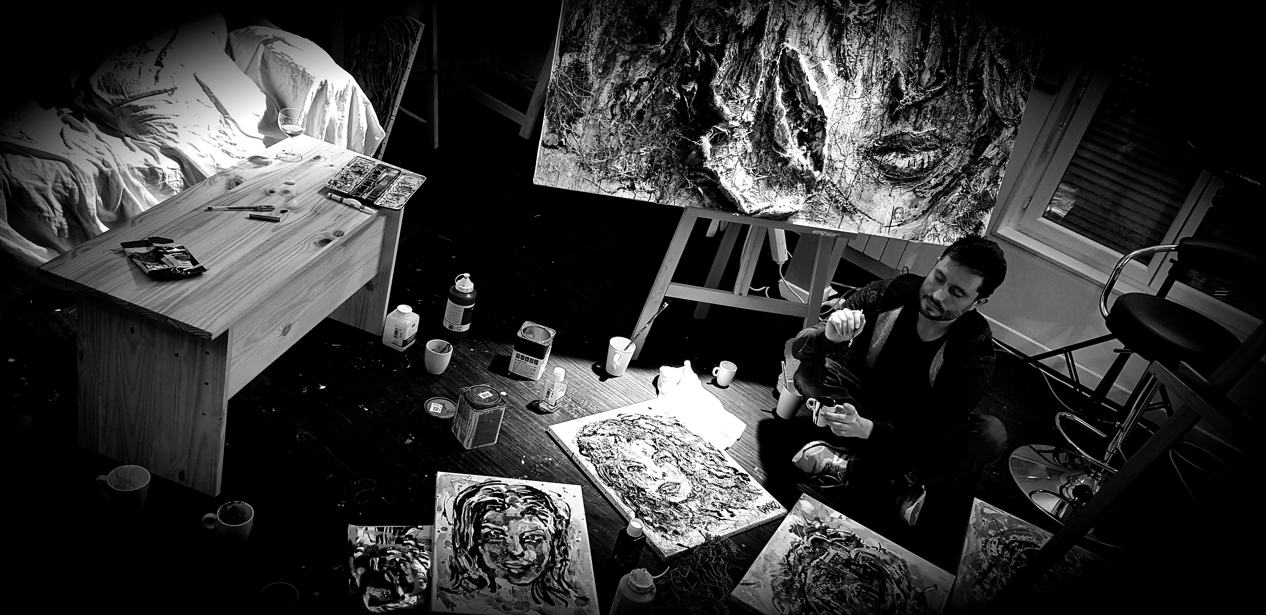 Samedi 3 février, se tenait le vernissage de sa rétrospective au Café culturel. Artiste singulier, il dérange, souvent séduit et finalement fascine. Les mots jaillissent avec passion lorsqu'il parle de son travail de création. Ses visages féminins, à la chevelure exubérante, sont des présences très fortes au regard parfois énigmatique. Empreintes de gravité, elles constituent un choc visuel et contrairement aux apparences, ce ne sont pas des portraits. Créations composites, enchevêtrements de réseaux, mise en tension de lignes, il laisse entrevoir ce qui existe derrière la surface de la peinture : l'âme humaine. Il précise volontiers sa démarche artistique. Dans l'atmosphère baignée de musique et d'encens de son atelier, tous ses sens sont mobilisés. L'esquisse, très vite réalisée, lui apparaît comme une évidence. Puis il “l'abîme”, se livre à une longue lutte, un corps à corps avec l'œuvre. Les émotions guident le geste. S'écrit alors une histoire dont les strates se superposent. Naît un visage qui s'impose à l'artiste... Visage ainsi livré à notre perception. À découvrir !
