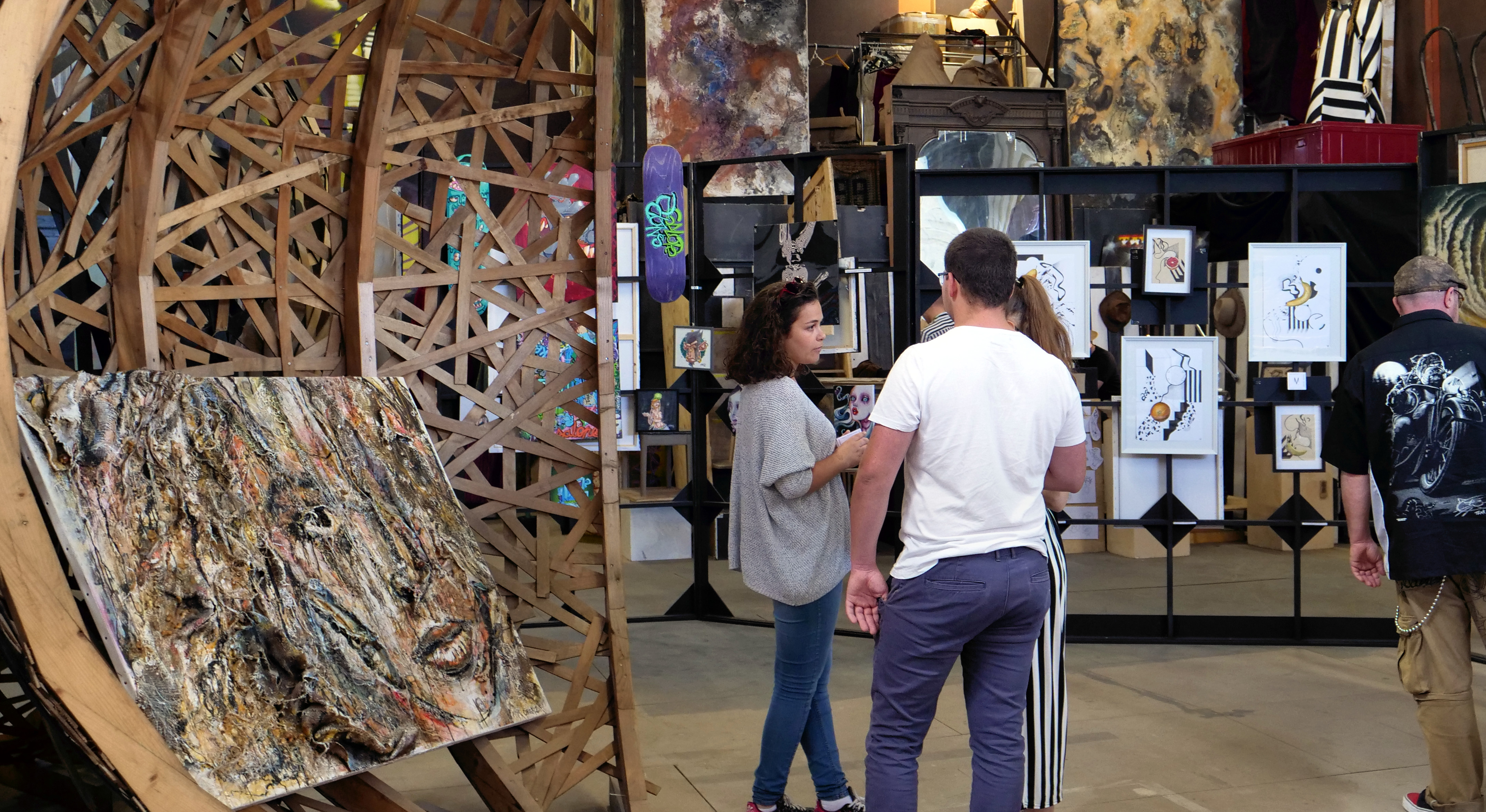 Trois tableaux de grande taille exposés dans les locaux industriels de l'association La Ronde de Nuit à Trilport (77), pour leur Festival des Arts III.