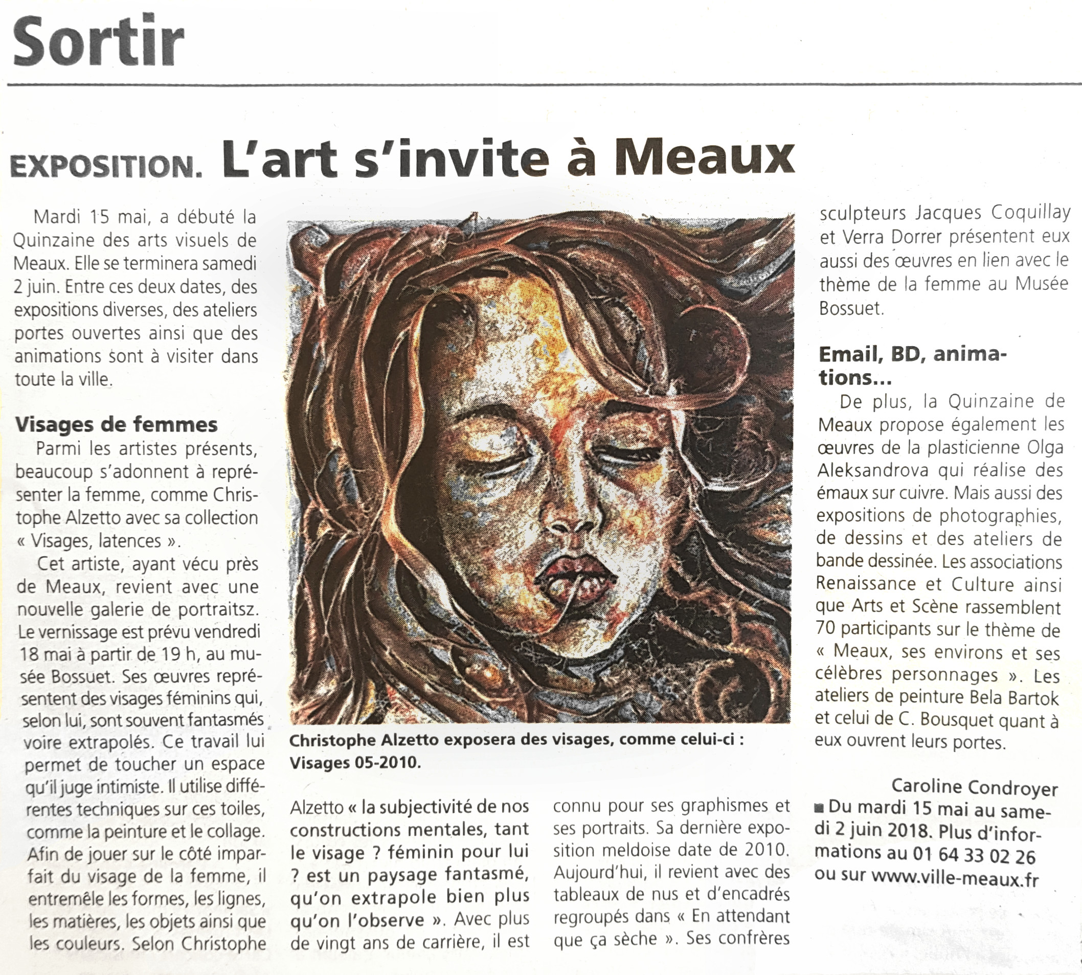 Cet artiste, ayant vécu près de Meaux, revient avec une nouvelle galerie de portraits. Le vernissage est prévu vendredi 18 mai à partir de 19h, au musée Bossuet. Ses œuvres représentent des visages féminins qui, selon lui, sont souvent fantasmés, voire extrapolés. Ce travail lui permet de toucher [à] un espace qu'il juge intimiste. Il utilise différentes techniques sur ces toiles, comme la peinture et le collage. Afin de jouer sur le côté imparfait du visage de la femme*, il entremêle les formes, les lignes, les matières, les objets ainsi que les couleurs. Selon Christophe Alzetto « la subjectivité de nos constructions mentales, tant le visage — féminin pour lui — est un paysage fantasmé, qu'on extrapole bien plus qu'on l'observe ». Avec plus de vingt ans de carrière, il est connu pour ses graphismes et ses portraits. Sa dernière exposition meldoise date de 2010. Aujourd'hui, il revient avec des tableaux nus [ou] encadrés regroupés dans [la collection] "En attendant que ça sèche". (...)