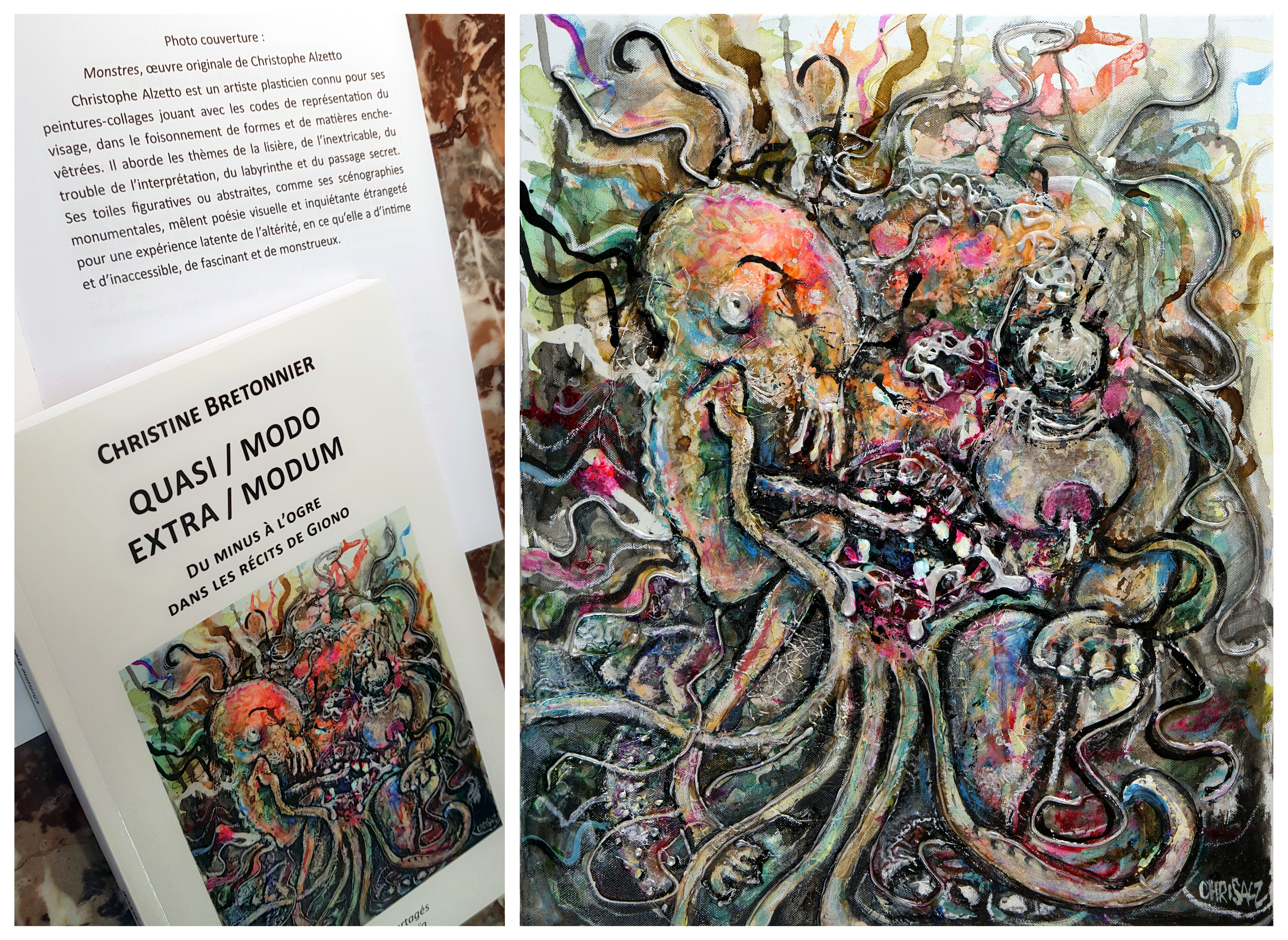 « Photo couverture : Monstres, œuvre originale de Christophe Alzetto. Christophe Alzetto est un artiste plasticien connu pour ses peintures-collages jouant avec les codes de représentation du visage, dans le foisonnement de formes et de matières enchevêtrées. Il aborde les thèmes de la lisière, de l'inextricable, du trouble de l'interprétation, du labyrinthe et du passage secret. Ses toiles figuratives ou abstraites, comme ses scénographies monumentales, mêlent poésie visuelle et inquiétante étrangeté pour une expérience latente de l'altérité, en ce qu'elle a d'intime et d'inaccessible, de fascinant et de monstrueux. »