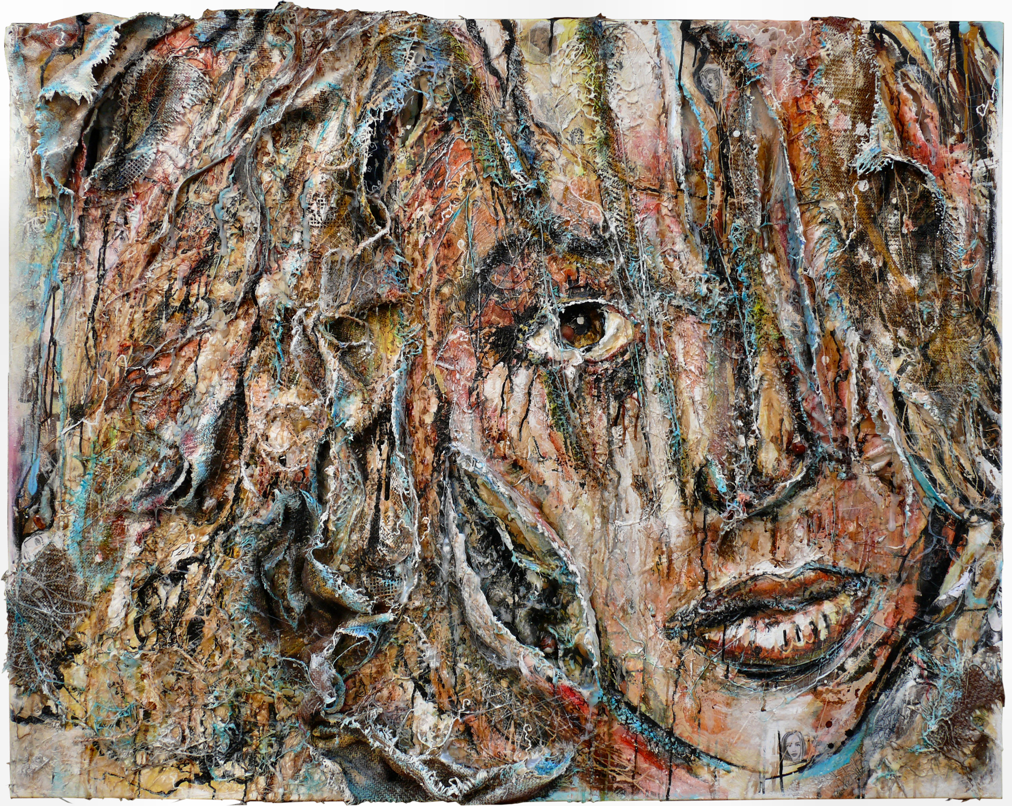 Acrylique, huile, encre de Chine, encre de couleur, huile en bâton, vernis à tableaux, vernis polyuréthane aspect brillant, aspect ciré, grains de café, café Sigri de Papouasie, gel filant acrylique, médium gel épais brillant, stylo argent, blanc correcteur, huile de lin, toiles de jute anciennes, toiles de lin, tissus de draps, colle vinylique, résine de colle, morceaux de bâche en plastique,noisettes, coquilles de noisettes, filasse, encre céramique, photocopies d'impressions à l'encre offset, sable du 123 avenue Clémenceau, amandes grillées et épicées d'Uzès, corde de chanvre, peaux de colle séchée, ambre, laque en bombe, cire de bougie, résille en oxyde d'aluminium, résille en carbure de silicium, peinture glycéro de la cave du 123 avenue Clémenceau, acrylique gloss, fil d'or, peinture nacrée, amandes effilées, semences, noix de cajou, petits dessins de visages au crayon, au feutre ou au stylo sur papier retrouvés de diverses périodes