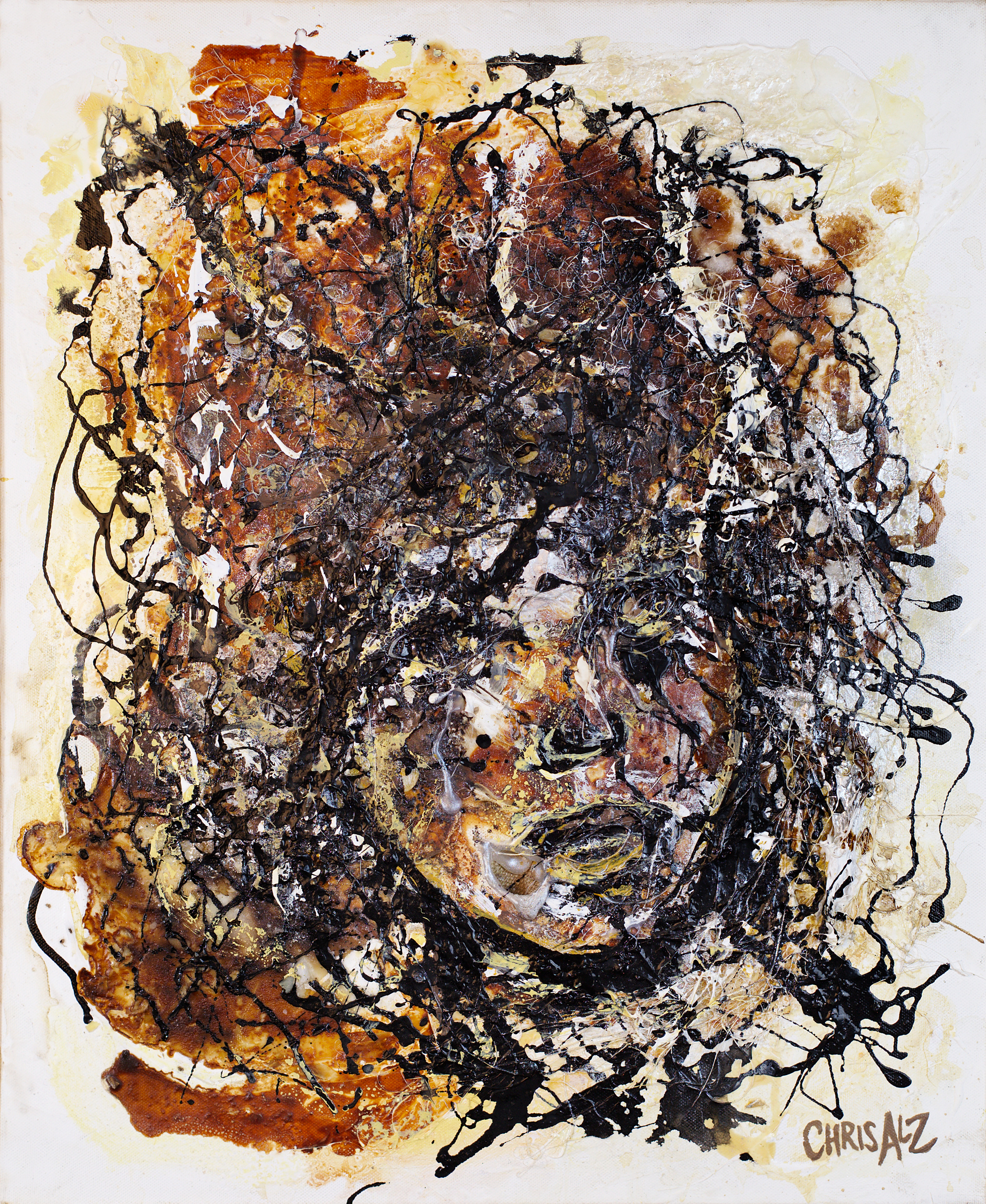 Acrylique, gesso, gouache, medium brillant épais, colle vynilique, filasse, café, vernis polyuréthane chêne doré brillant, pigments ocre jaune, cire au chalumeau, vernis acrylique brillant, vernis polyuréthane satiné, amandes effilées, ambre, encre de chine, white spirit, eau, résine de colle, peinture métallisée, mèches de coton, toile de jute, peinture à l'huile nacrée
