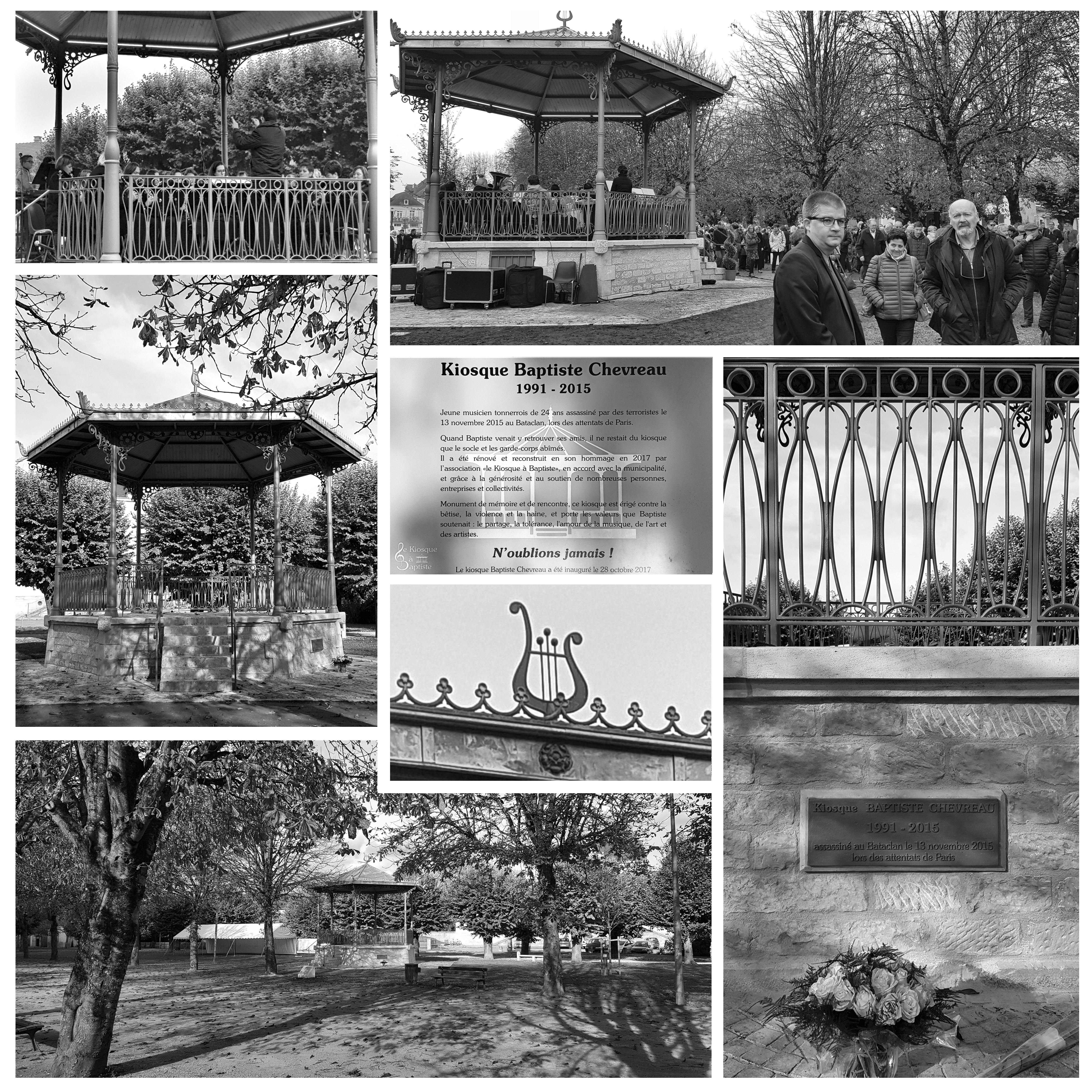 Ce kiosque, monument faisant partie du patrimoine de Tonnerre, a été démonté dans les années 80, il n'en reste que le socle, abîmé, et il mérite vraiment une remise en état. Il sera érigé contre la bêtise, la violence et la haine, et portera les valeurs que Baptiste soutenait : la tolérance, l'amour, de la musique, de l'art et des artistes... Ce kiosque portera son nom : "Kiosque Baptiste Chevreau".