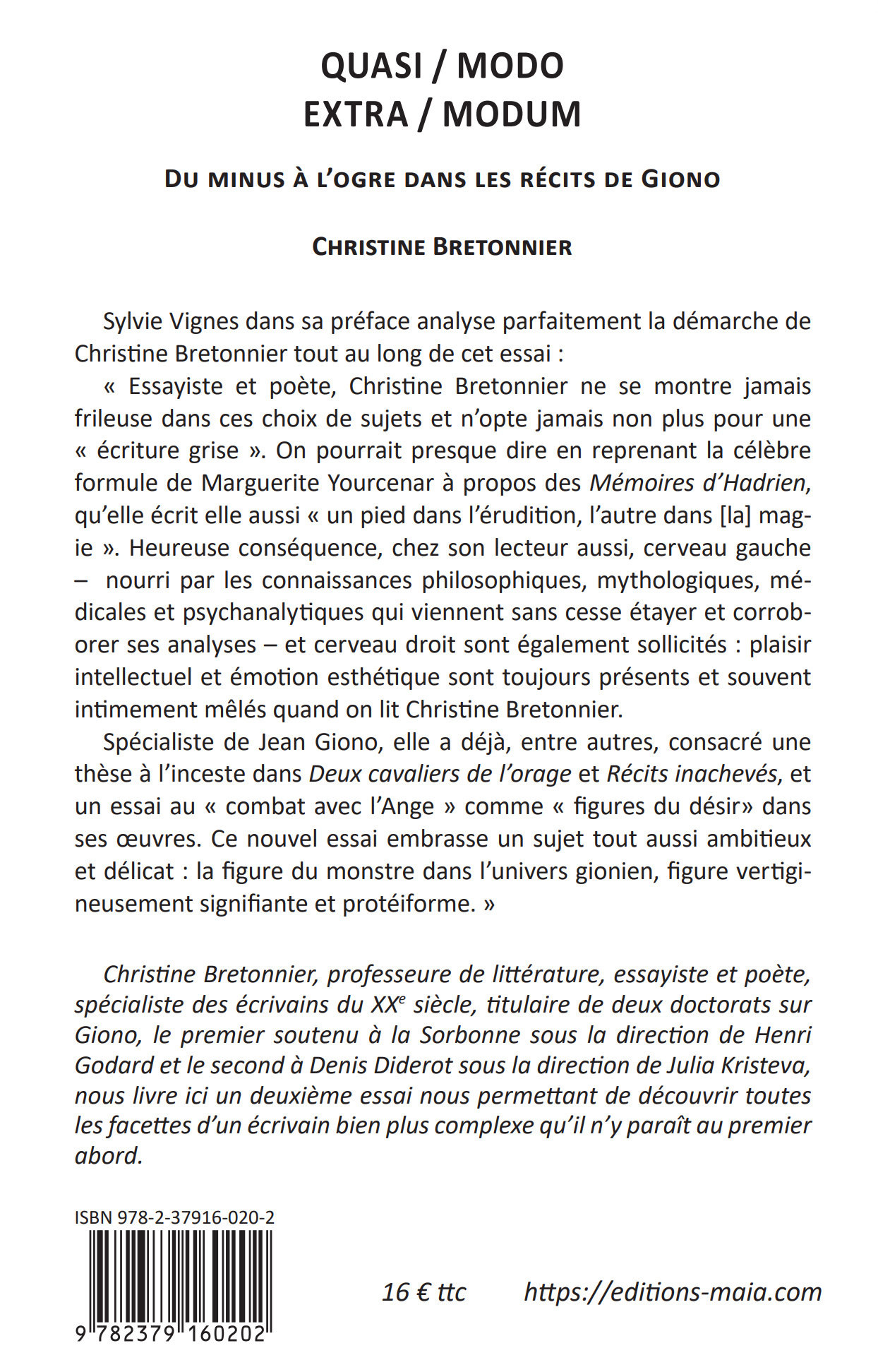 Parution du livre Quasi/Modo Extra/Modum — Du minus à l'ogre dans les récits de Giono, par Christine Bretonnier, dans la collection Savoirs partagés aux éditions Maïa. Préface de Sylvie Vignes.