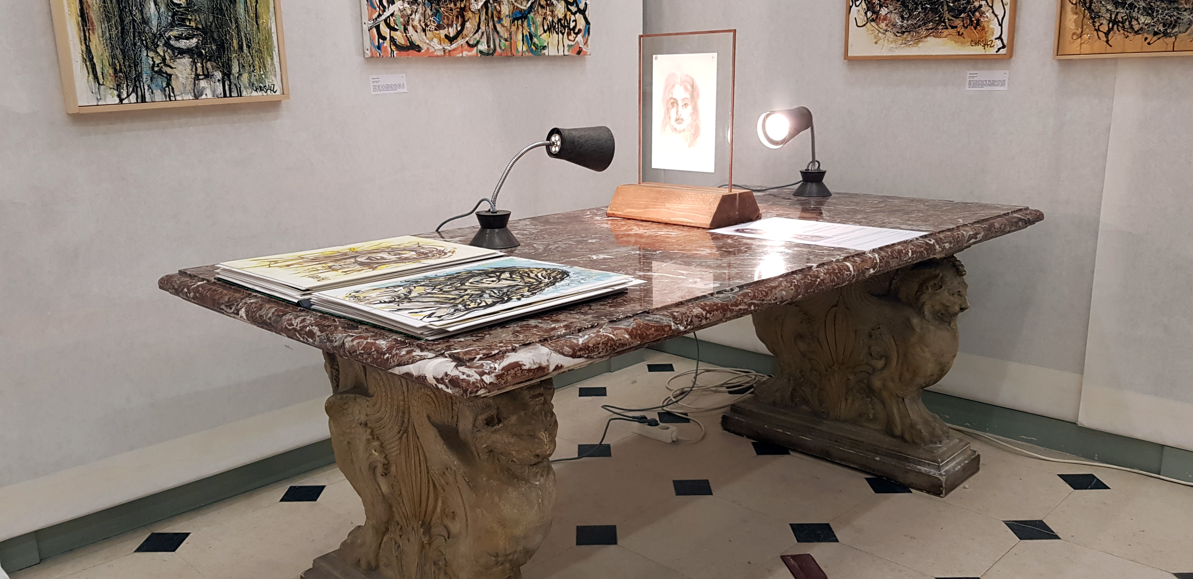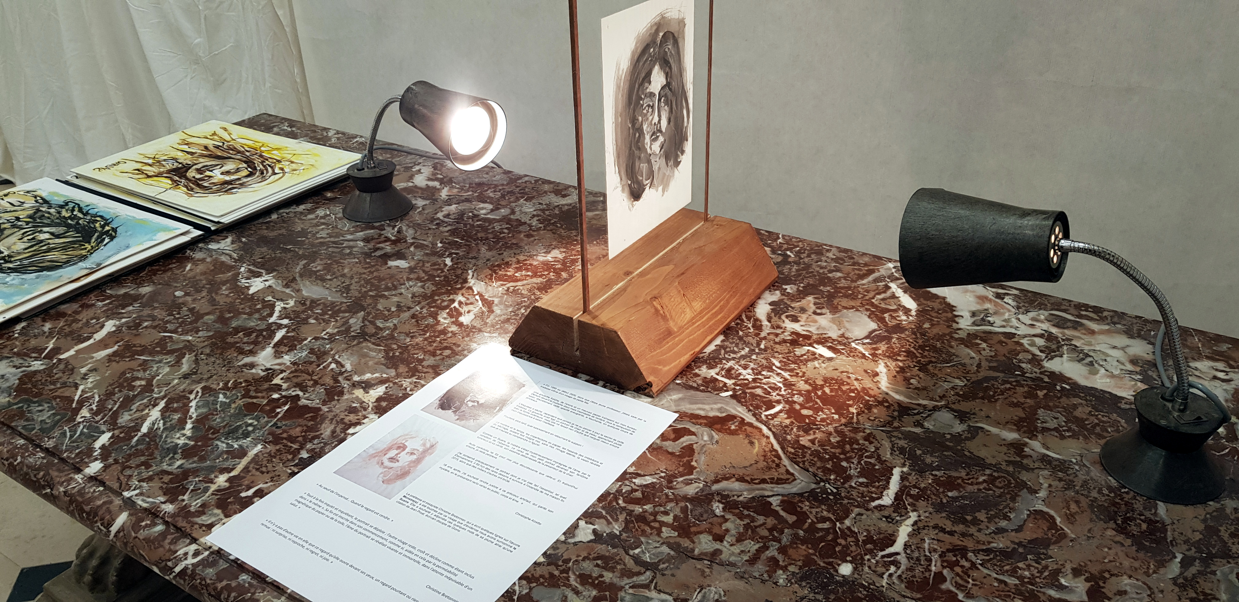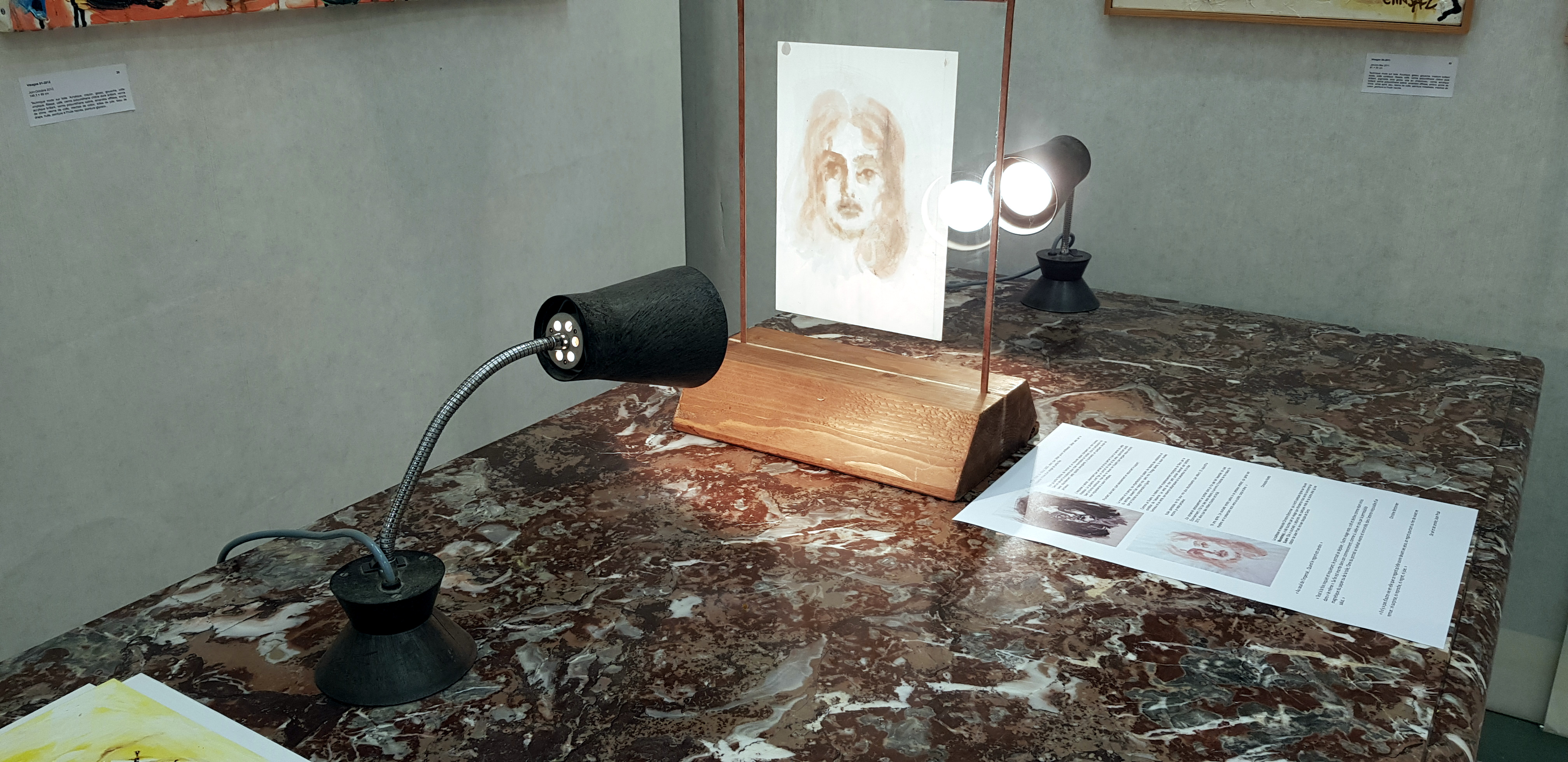 Dispositif de présentation d'une gouache et encre sur papier de 1999/2000. Lampes articulées sur leur socle de fonte, entre-deux verres rembordés, en insertion sur leur socle en pin des Vosges fini au brou de noix et cire d'abeille. Table de marbre de la Salle du Patrimoine, ancienne demeure de Bossuet, Cité épiscopale de Meaux.