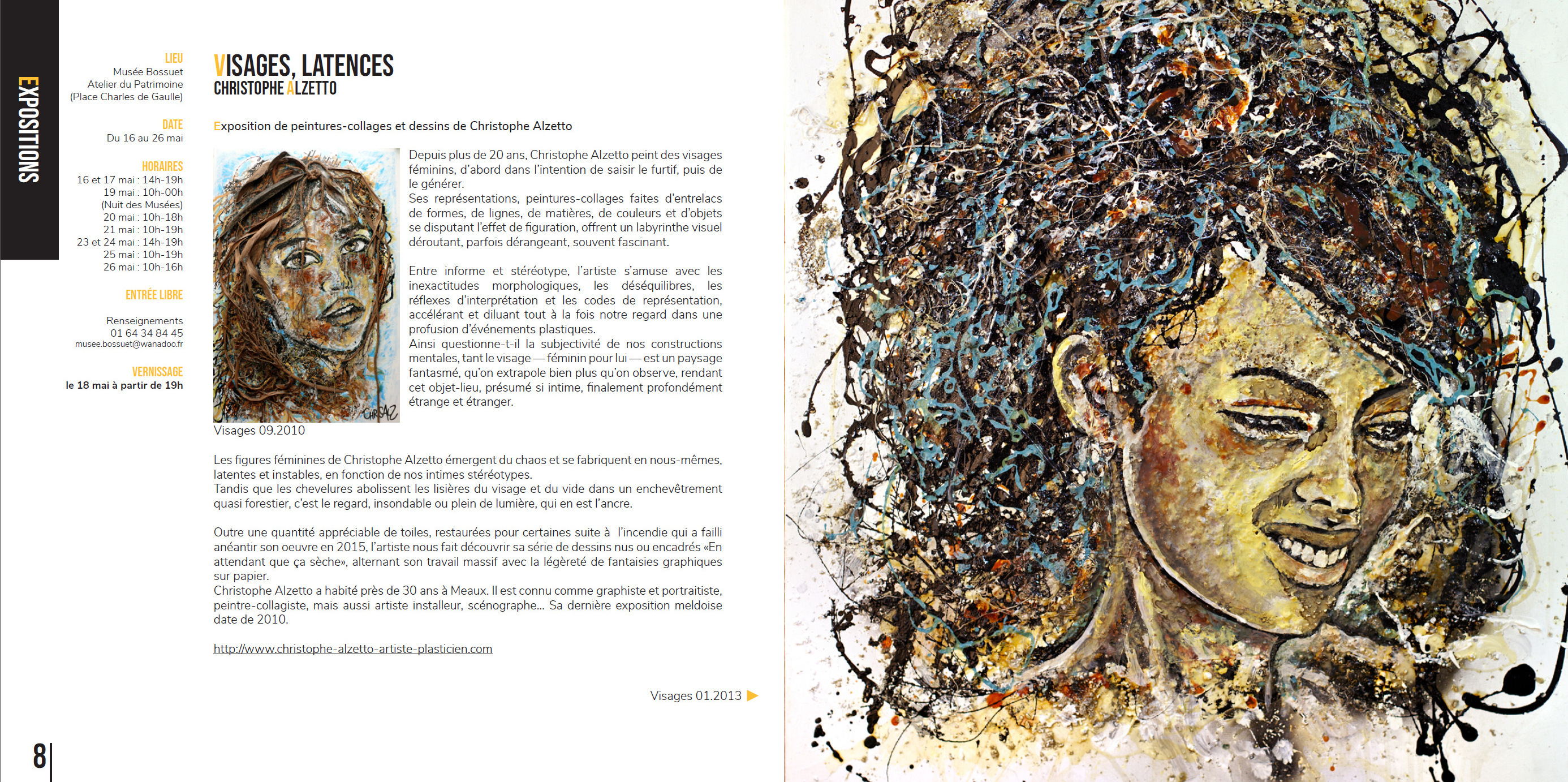 Cet artiste, ayant vécu près de Meaux, revient avec une nouvelle galerie de portraits. Le vernissage est prévu vendredi 18 mai à partir de 19h, au musée Bossuet. Ses œuvres représentent des visages féminins qui, selon lui, sont souvent fantasmés, voire extrapolés. Ce travail lui permet de toucher [à] un espace qu'il juge intimiste. Il utilise différentes techniques sur ces toiles, comme la peinture et le collage. Afin de jouer sur le côté imparfait du visage de la femme*, il entremêle les formes, les lignes, les matières, les objets ainsi que les couleurs. Selon Christophe Alzetto « la subjectivité de nos constructions mentales, tant le visage — féminin pour lui — est un paysage fantasmé, qu'on extrapole bien plus qu'on l'observe ». Avec plus de vingt ans de carrière, il est connu pour ses graphismes et ses portraits. Sa dernière exposition meldoise date de 2010. Aujourd'hui, il revient avec des tableaux nus [ou] encadrés regroupés dans [la collection] "En attendant que ça sèche". (...)