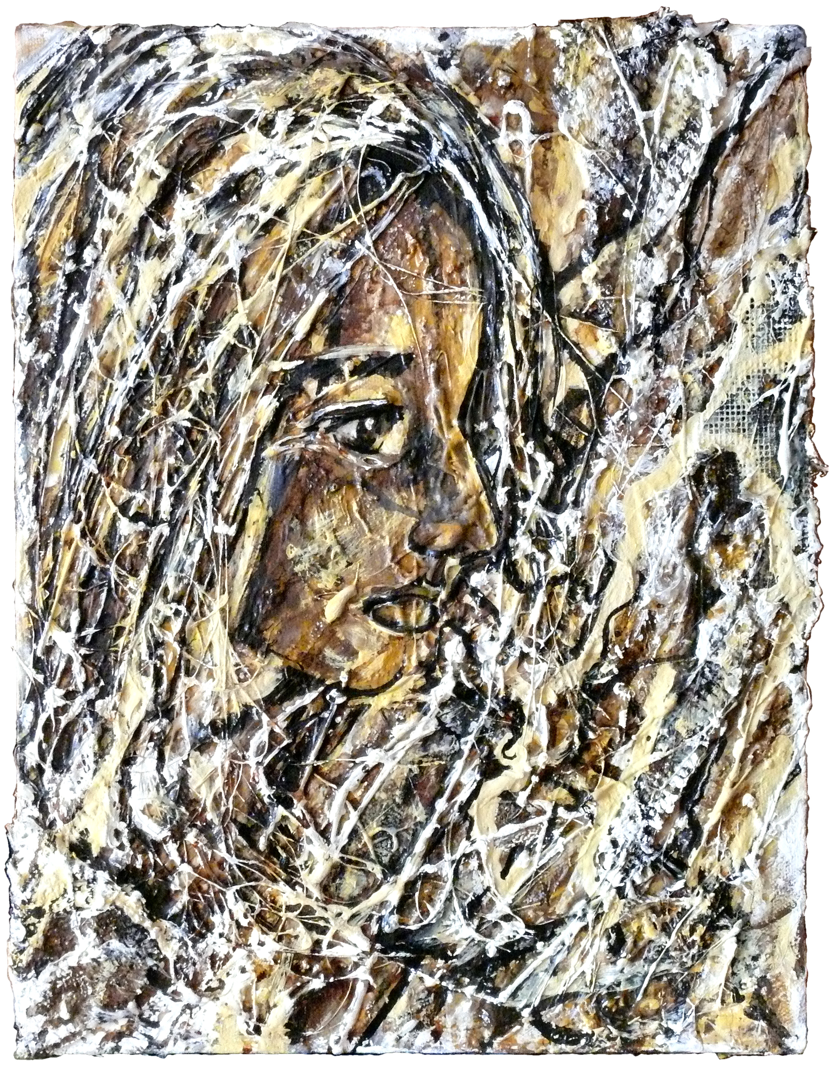 Acrylique, café, filasse, toile de jute, résille en carbure de silicium, écorce de murier, colle vinylique, vernis polyuréthane aspect ciré, huile en bâton, résine de colle, encre de Chine